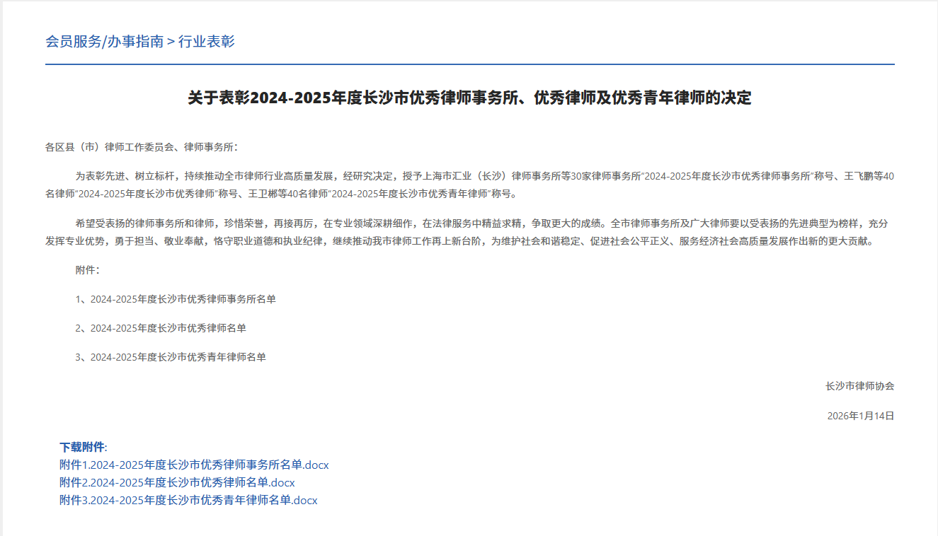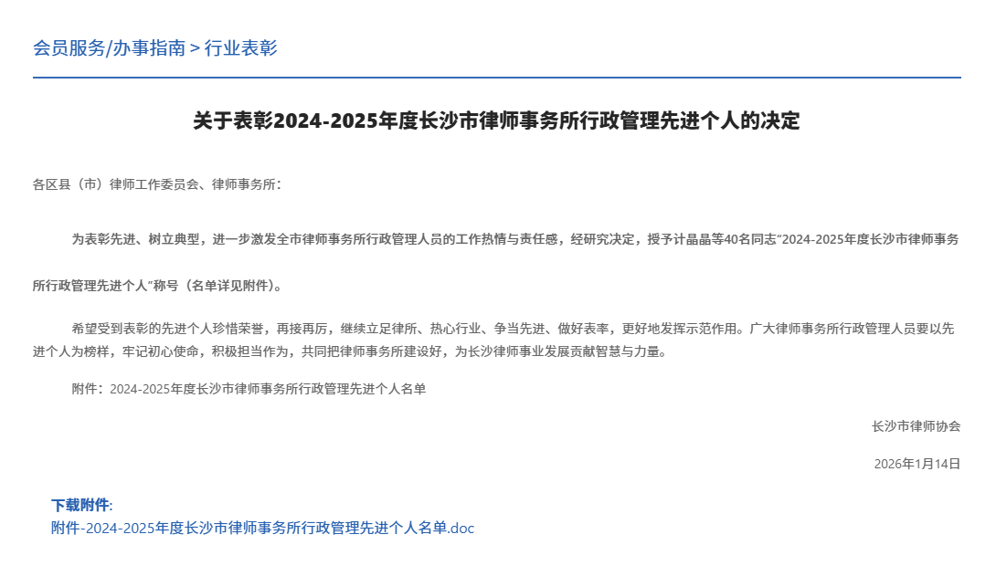 为表彰先进、树立标杆,持续推动全市律师行业高质量发展。2026年1月14日,长沙市律师协会发布了《关于表彰2024-2025年度长沙市优秀律师事务所、优秀律师及优秀青年律师的决定》和《关于表彰2024-2025年度长沙市律师事务所行政管理先进个人的决定》,我所高级合伙人、执行主任毛劲松被评为长沙市优秀律师;一级合伙人、第二党支部书记胡栋被评为长沙市优秀青年律师;行政主管罗新枝被评为长沙市律师事务所行政管理先进个人。